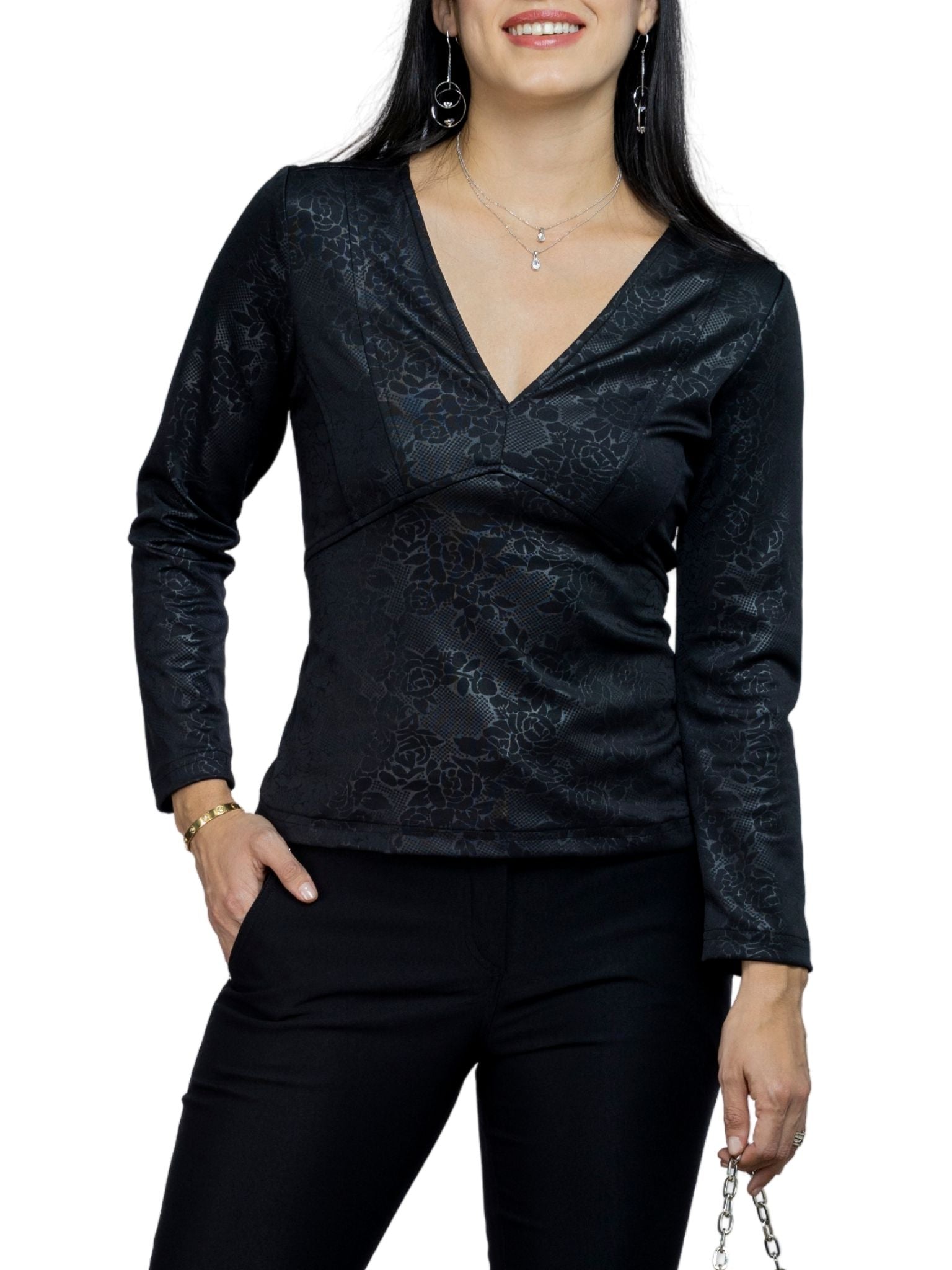 Con un escote en V que estiliza tu cuello y rostro, y cortes estratégicos debajo del busto que realzan tu figura, esta prenda está diseñada para hacerte sentir poderosa y atractiva.