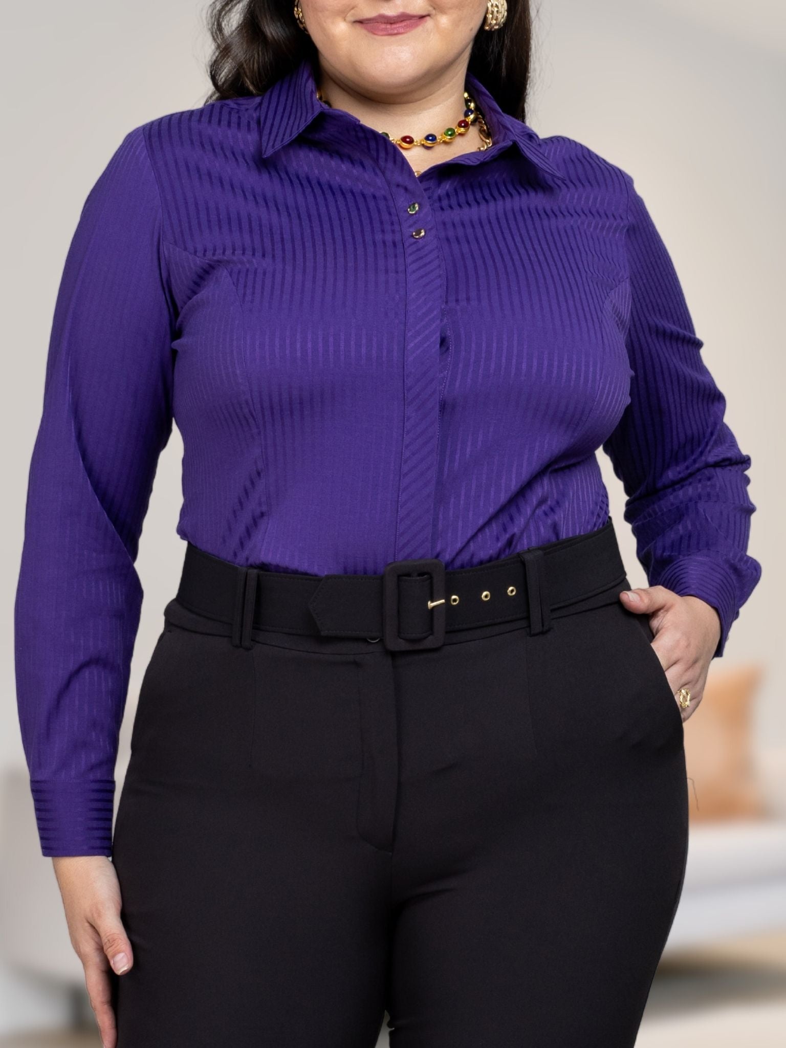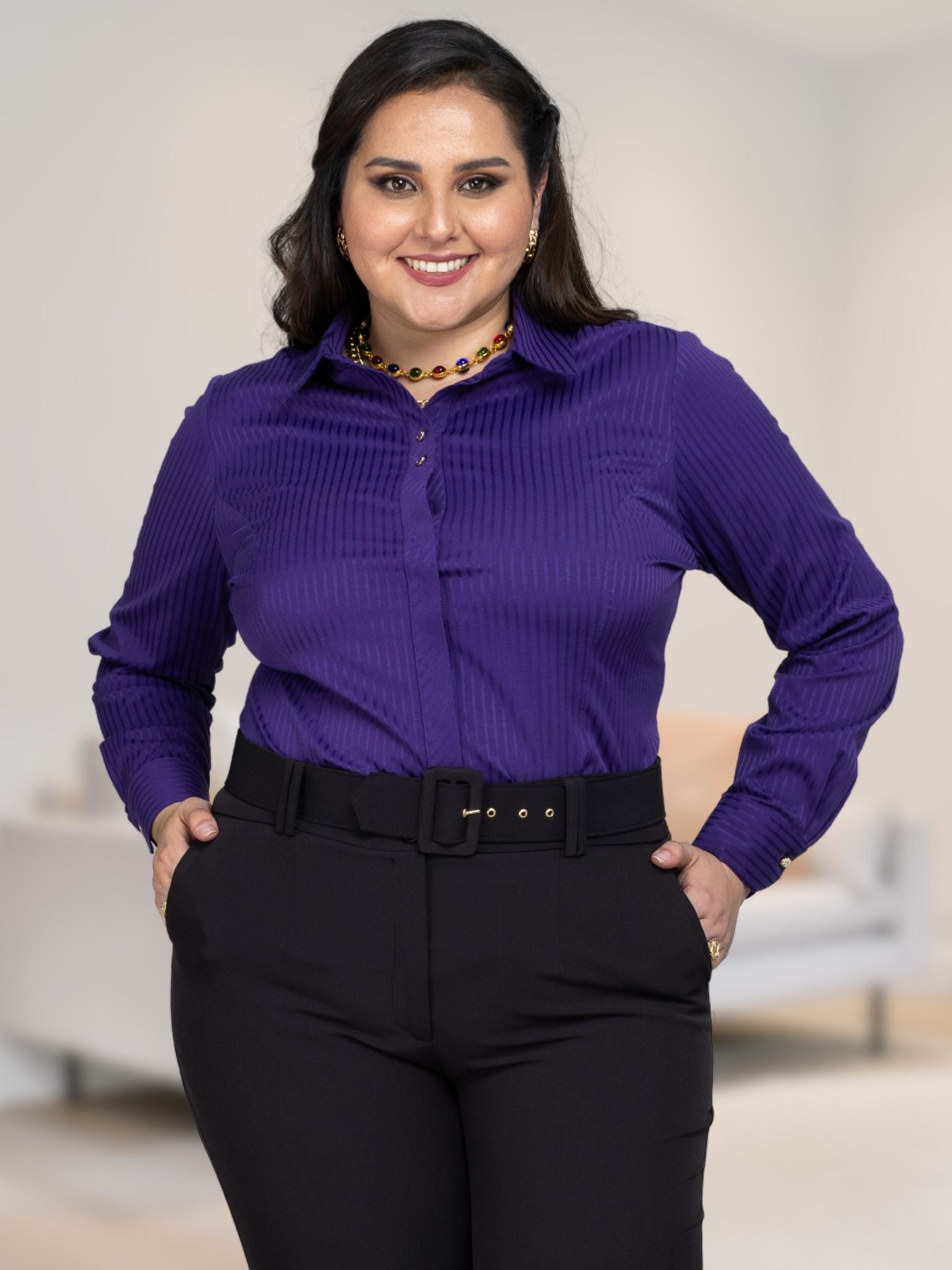 Crea infinidad de looks, desde formales hasta informales con una blusa camisera que define tu cintura y alarga tu silueta. Puedes usarla cerrada para looks de etiqueta o abierta combinada con un top o una playera para un look chic.